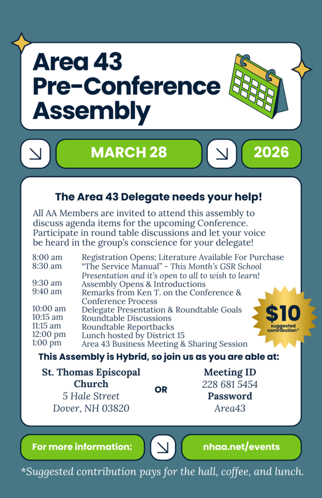 This Sharing session is focused on disseminating the Agenda Items for the 2026 General Service Conference.  Together we will go Through these Agenda items and Background information.  Then you’ll be able to take this information back to your groups and generate an informed Group Conscience.  Then you can share this back with me at the Area 43 Pre conference assembly March 28th.
