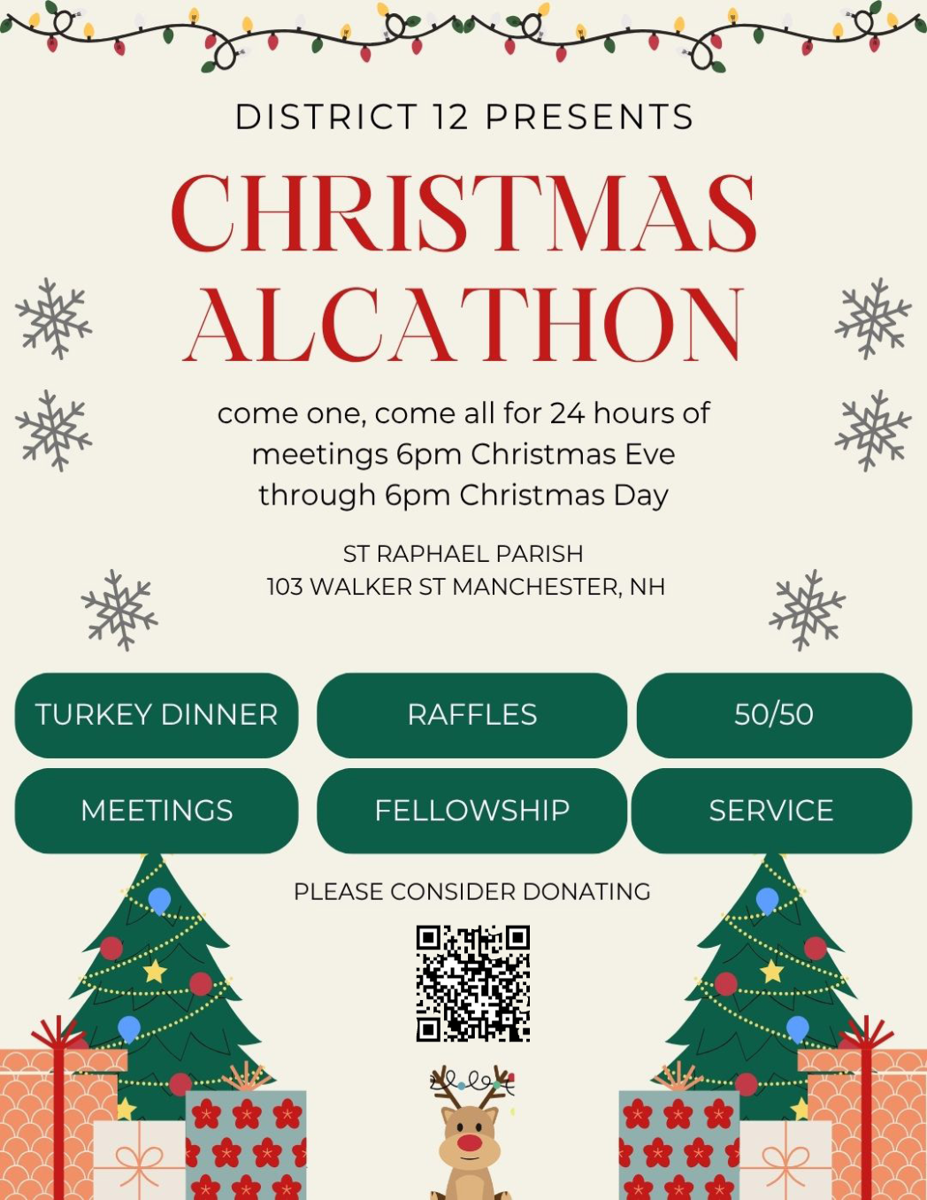24 hours of meetings at St. Raphael’s Church Manchester 103 Walker St. 6pm on Christmas eve until 6pm Christmas night. Meetings on the hour every hour.
