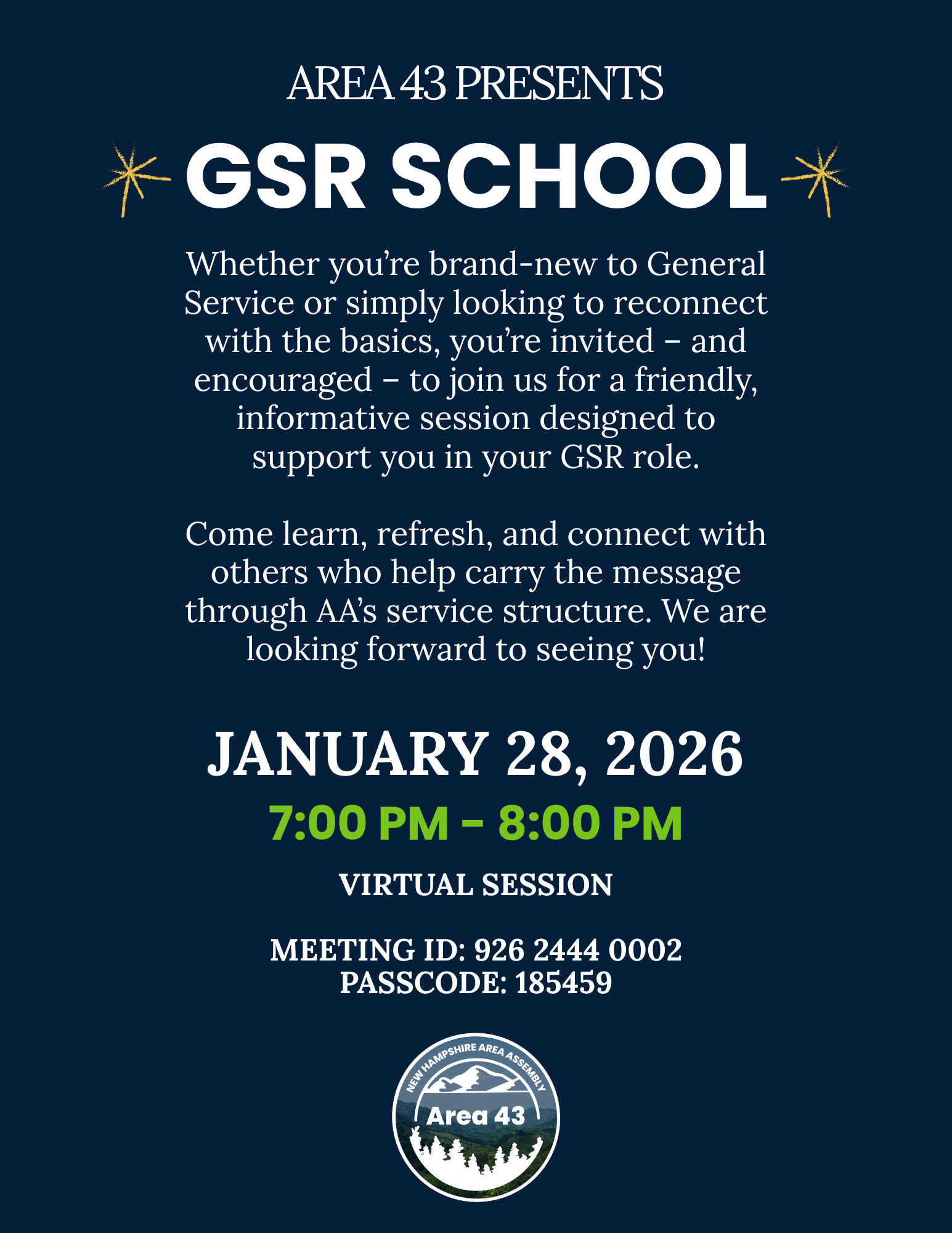 Whether you’re brand‑new to General Service or simply looking to reconnect with the basics, you’re invited ~ and encouraged ~ to join us for a friendly, informative session designed to support you in your GSR role.