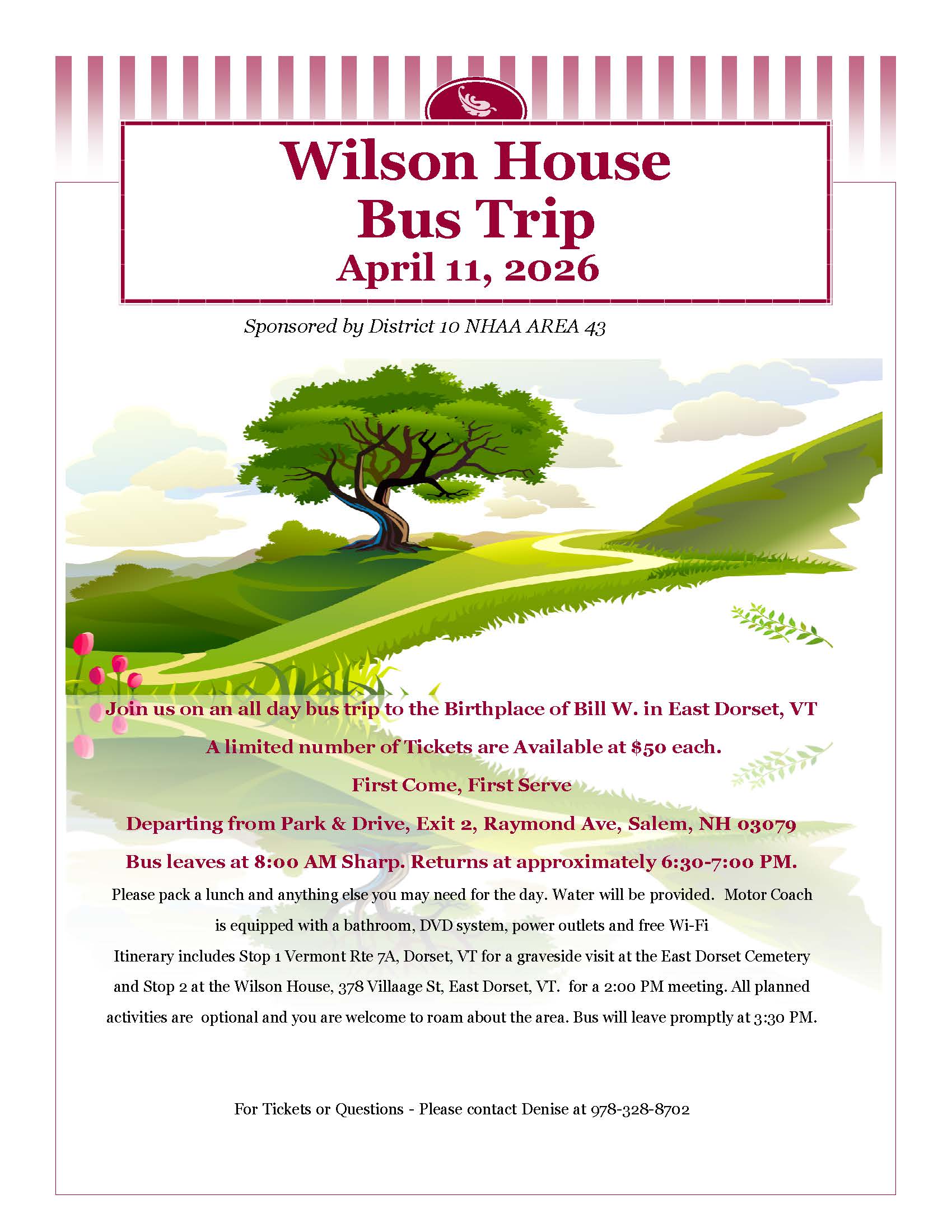 Day long bus trip from Salem, NH to the Wilson House, including graveside visit and 2PM meeting at Bills House. Sponsored by District 10. Coach bus transportation, water provided, bring your own lunch.
