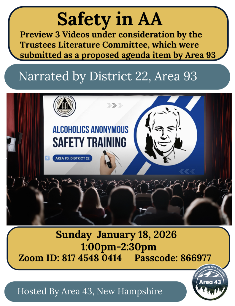 Download a PDF of the Flyer Preview 3 Safety videos that will be discussed at the General Service Conference 2026. Narrated by District 22, Area 93 central California. We will here about how these videos came to be then Preview the videos with Q & A following each Video. Meeting ID: 817 4548 0414 […] District 12 Committee Meeting 6:00 pm – 8:00 pm St. Raphael Church Ferry Street Entrance 103 Walker Street, Manchester, NH 03102 and via ZOOM https://zoom.us/j/306311205?pwd=VnlyZG9sS3J6V2w0SzFaVGN6eWd6UT09 Meeting ID: 306 311 205 Password is usual meeting password If you need password, email district12webmaster@gmail.com |