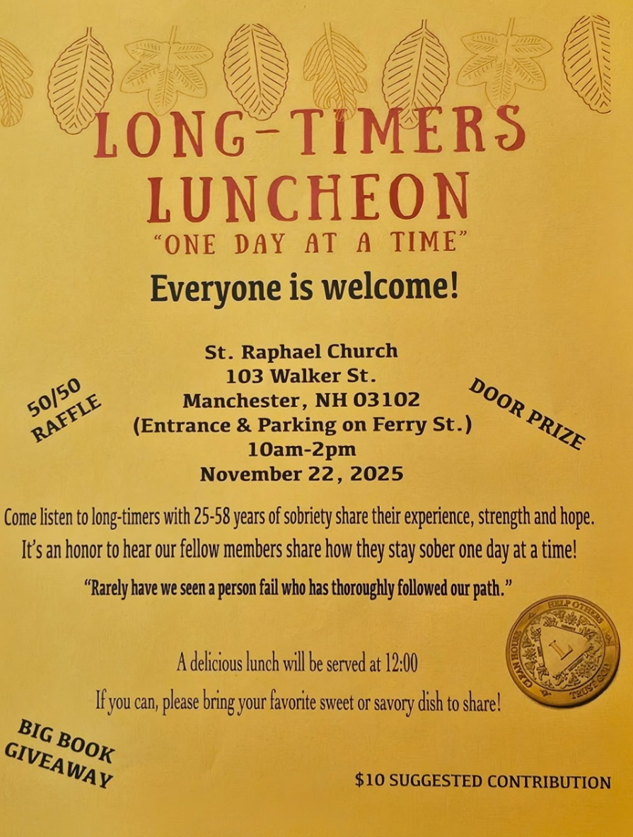 St Raphael's Church 103 Walker St, ManchesterA luncheon with the Longtimers. Hear Longtimers from 25-58 years of sobriety share their experience, strength and hope